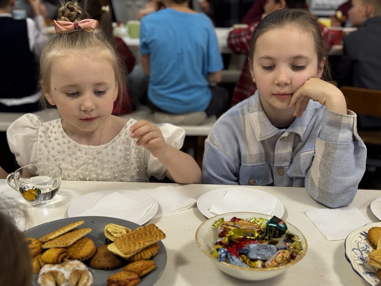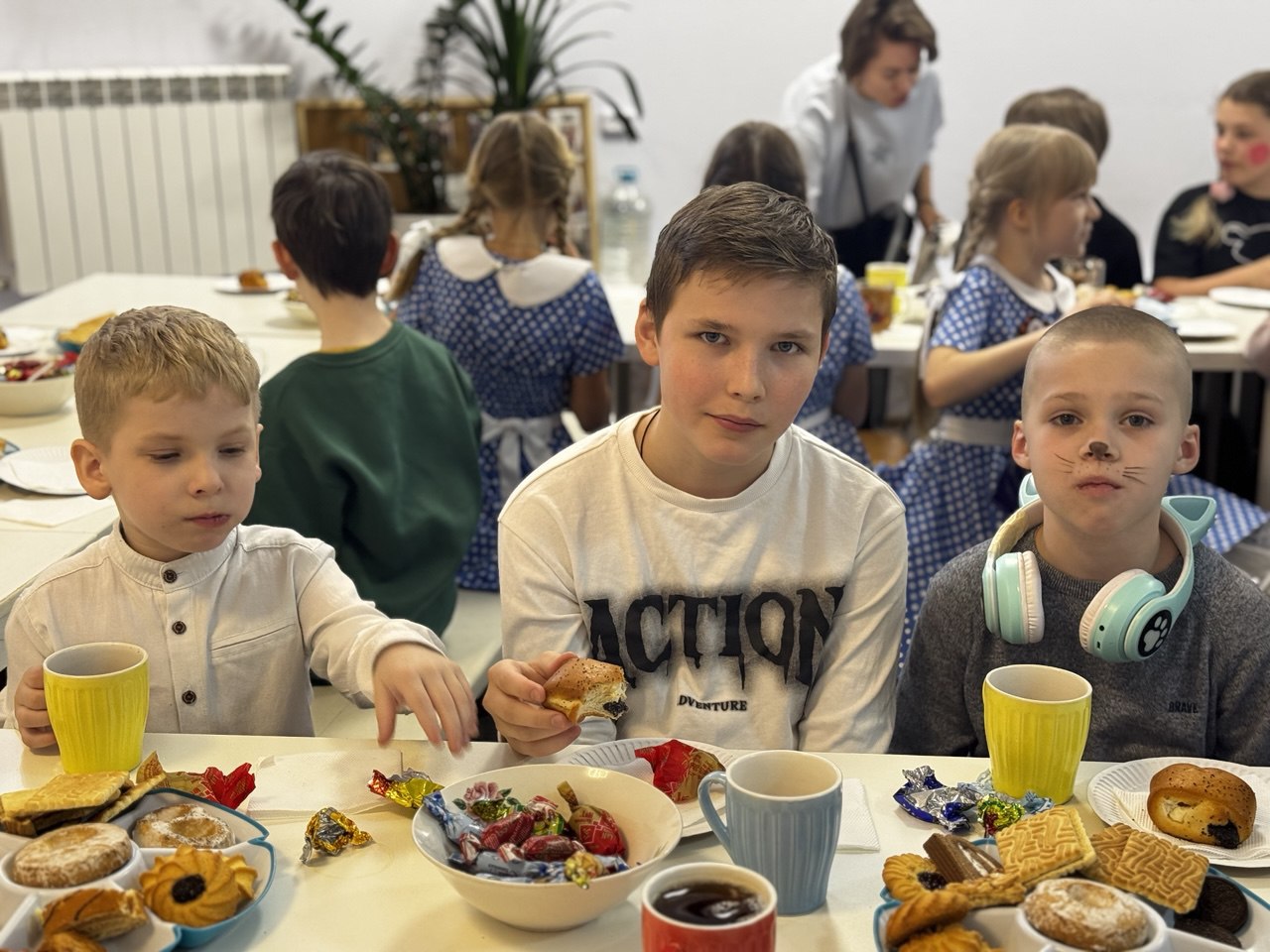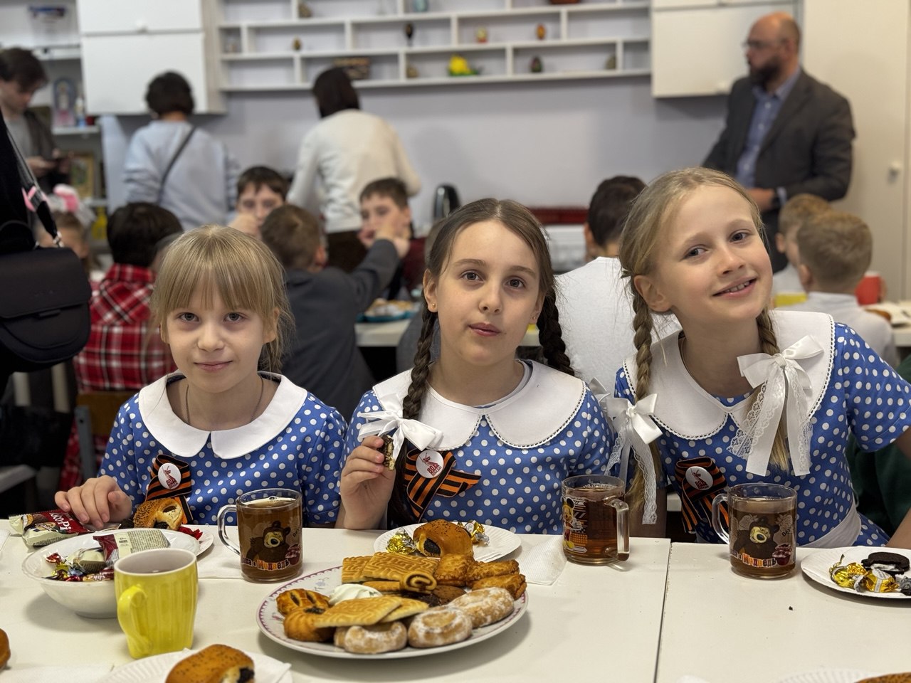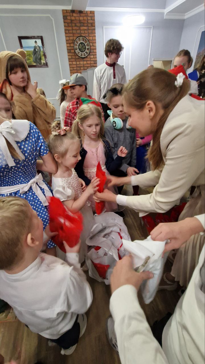 Каждый ребенок получил символический подарок: большие пряники и шоколадки, яркие многослойные деревянные раскраски яиц для малышей и миниатюрные модели Храма Христа Спасителя для старших ребят. После завершения концертной программы состоялась праздничная трапеза с чаем и угощениями, где дети делились своими впечатлениями.