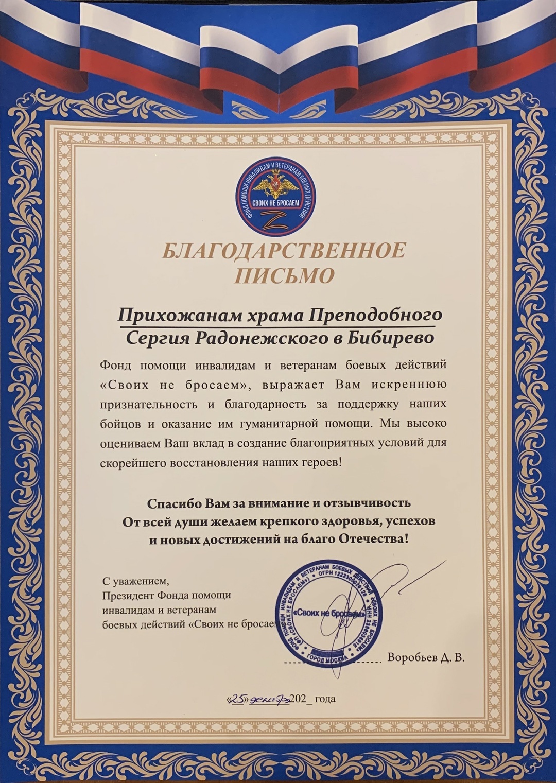 Благодарственное письмо прихожанам храма преподобного Сергия Радонежского в Бибиреве.