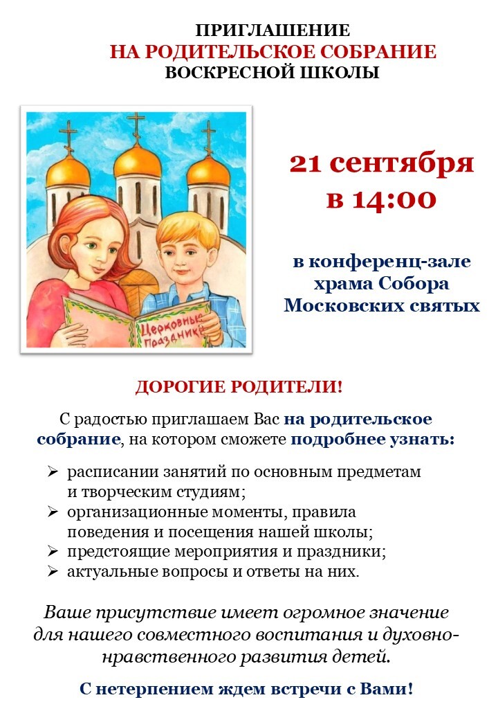 21 сентября 2025 г. в 14:00 в конференц-зале пройдет родительское собрание детской воскресной школы