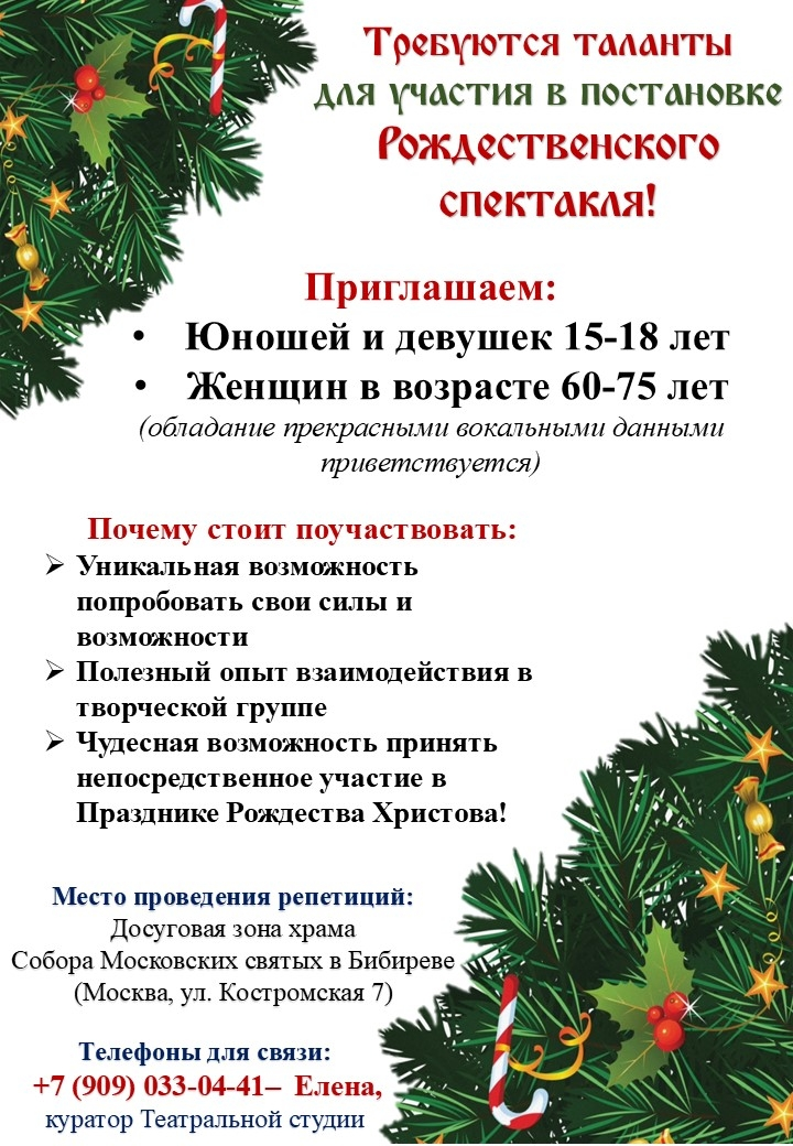 Для участия в постановке рождественского спектакля в нашем храме приглашаем юношей, девушек и женщин, желающих принять участие в праздновании Рождества Христова и попробовать свои силы в театральном творчестве.