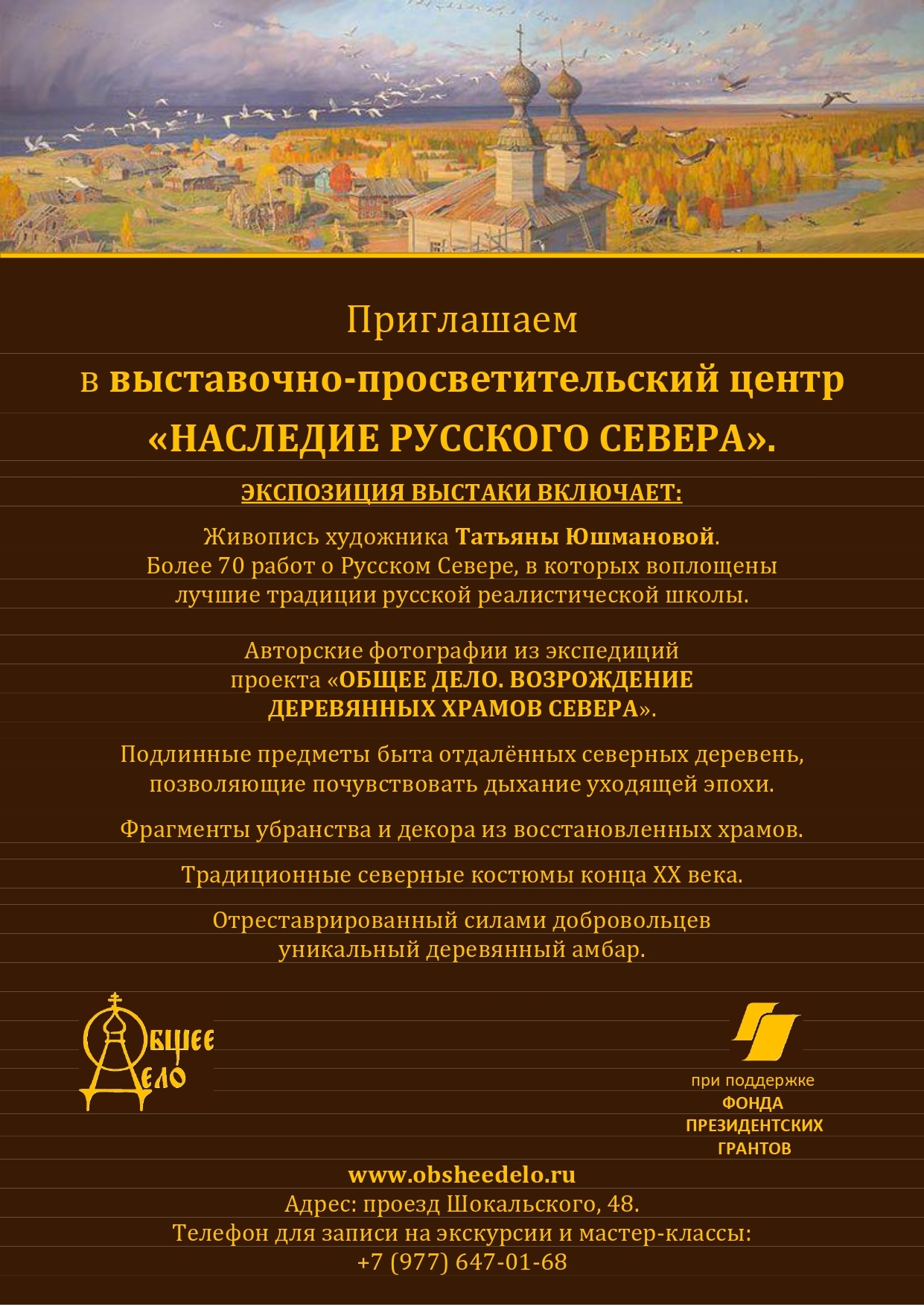 В экспозицию выставки входят показ живописи художника Татьяны Юшмановой, в работах которой воплощены лучшие традиции русской реалистической школы, а также представлены авторские фотографии из экспедиций в рамках проекта «Общее Дело. Возрождение деревянных храмов Севера».