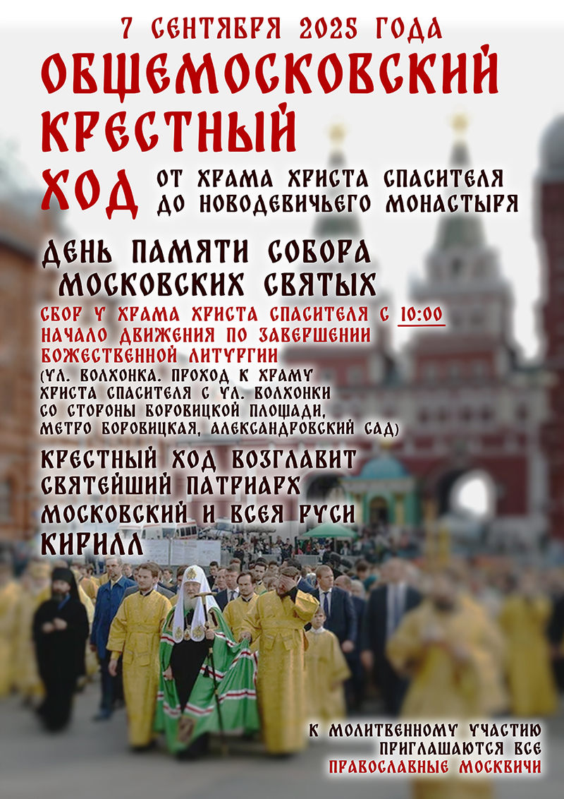 По благословению Святейшего Патриарха Московского и всея Руси Кирилла 7 сентября 2025 года, в Неделю 13-ю по Пятидесятнице, день празднования Собора Московских святых, состоится общемосковский крестный ход от кафедрального соборного Храма Христа Спасителя г. Москвы до Новодевичьего ставропигиального женского монастыря.