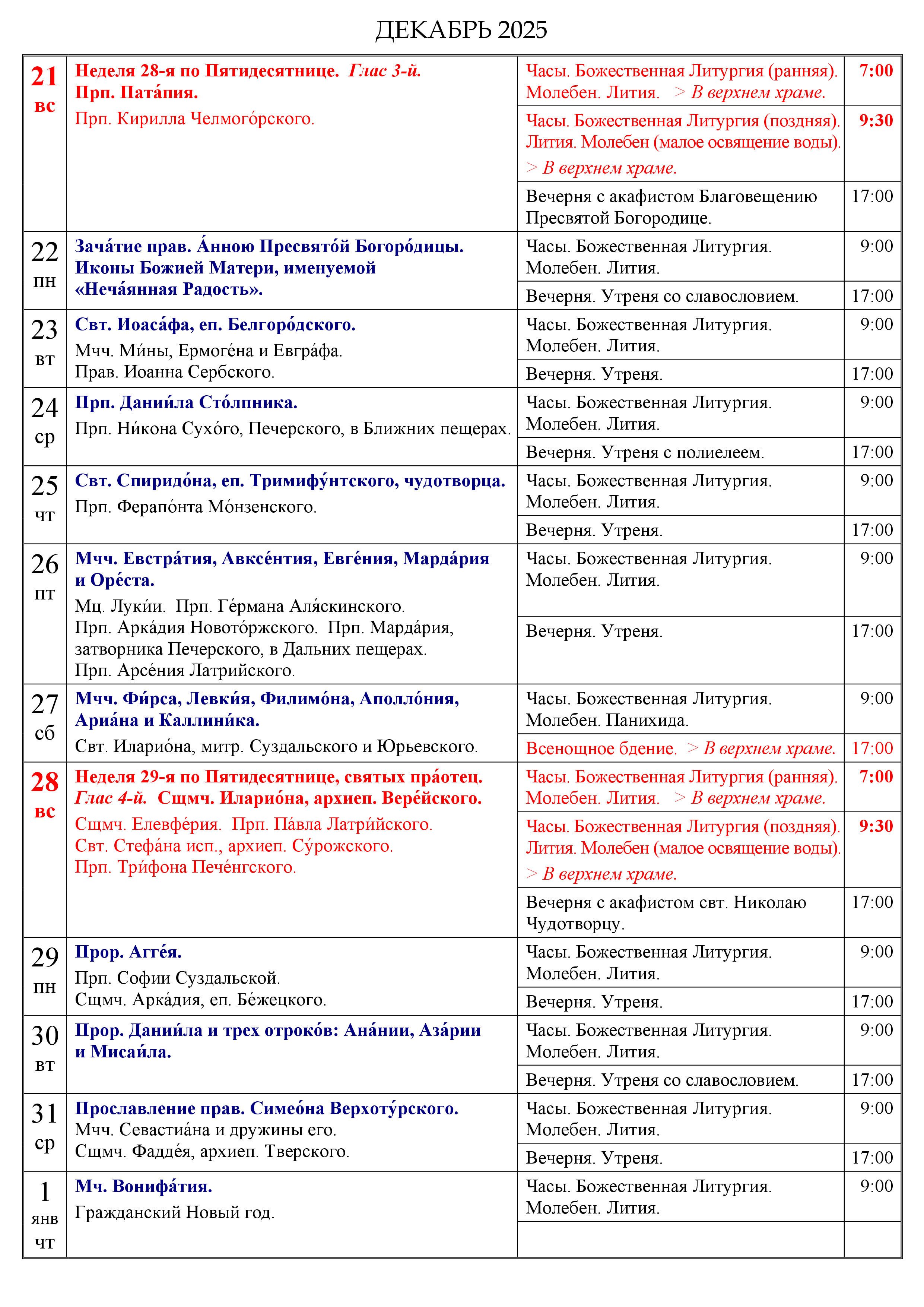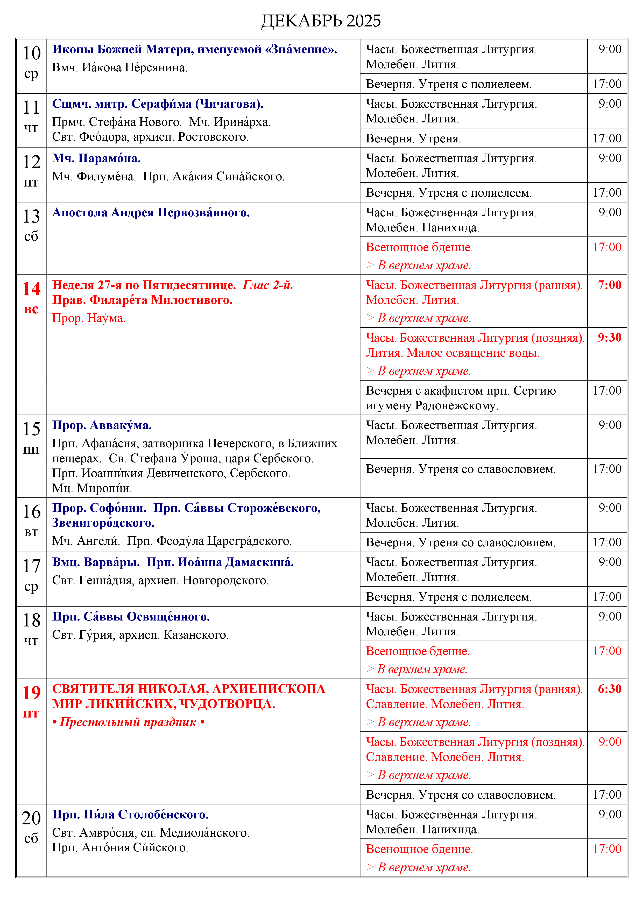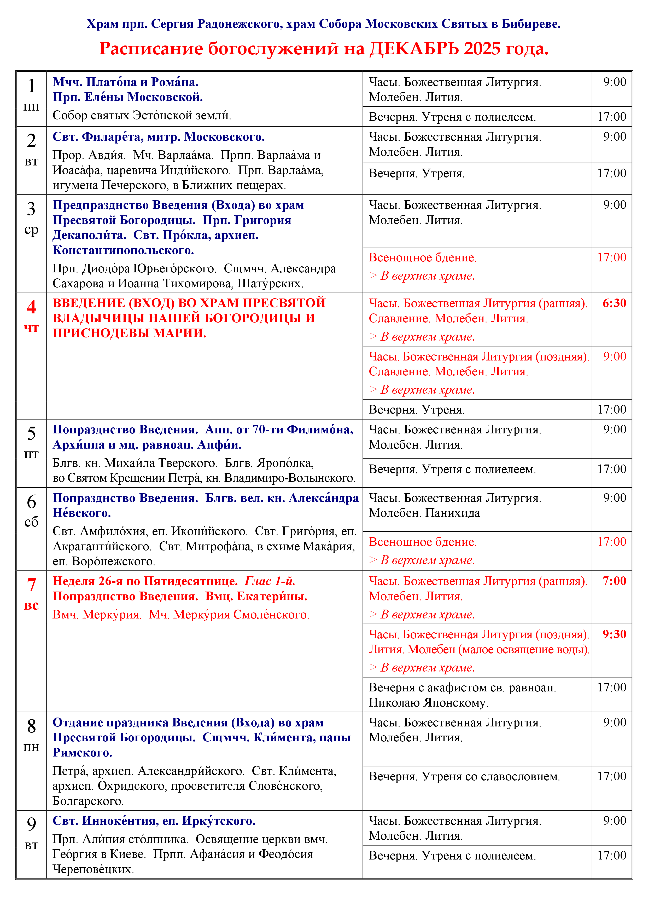 Расписание на декабрь 2025
