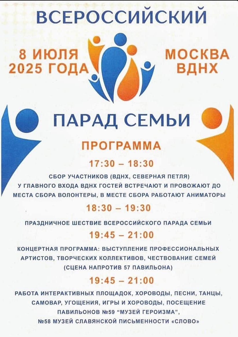 8 июля 2025 г. Всероссийский Парад Семьи пройдет более, чем в 100 городах по всей стране. В Москве – на ВДНХ.